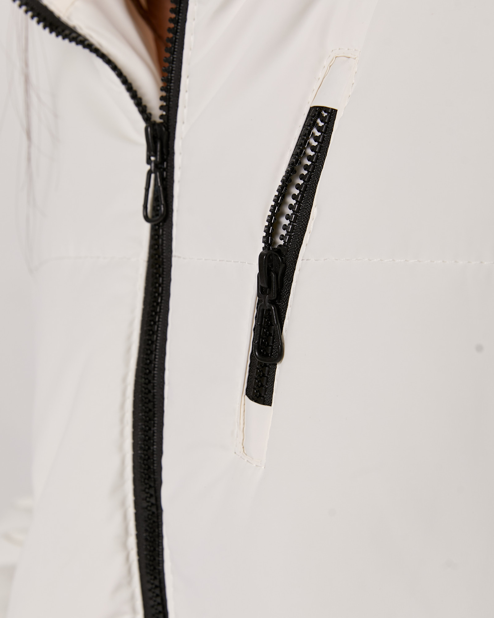 Демісезонна куртка актуального прямого вільного крою, утеплена на синтепоні. Модель з трьома кишенями - бічними листочками та вехньою кишенею з блискавкою. Рукав довгий, вшивний, двохшовний. Низ рукава можна відвертати манжетою. Застібка центральна на тасьму блискавку та внутрішня планка. Виріб з коміром стійкою та з'ємним капюшоном об'ємної красивої форми. По низу виробу - з виворітньої сторони, резиновий шнур з блочками та фіксаторами, для регулювання ширини по низу.