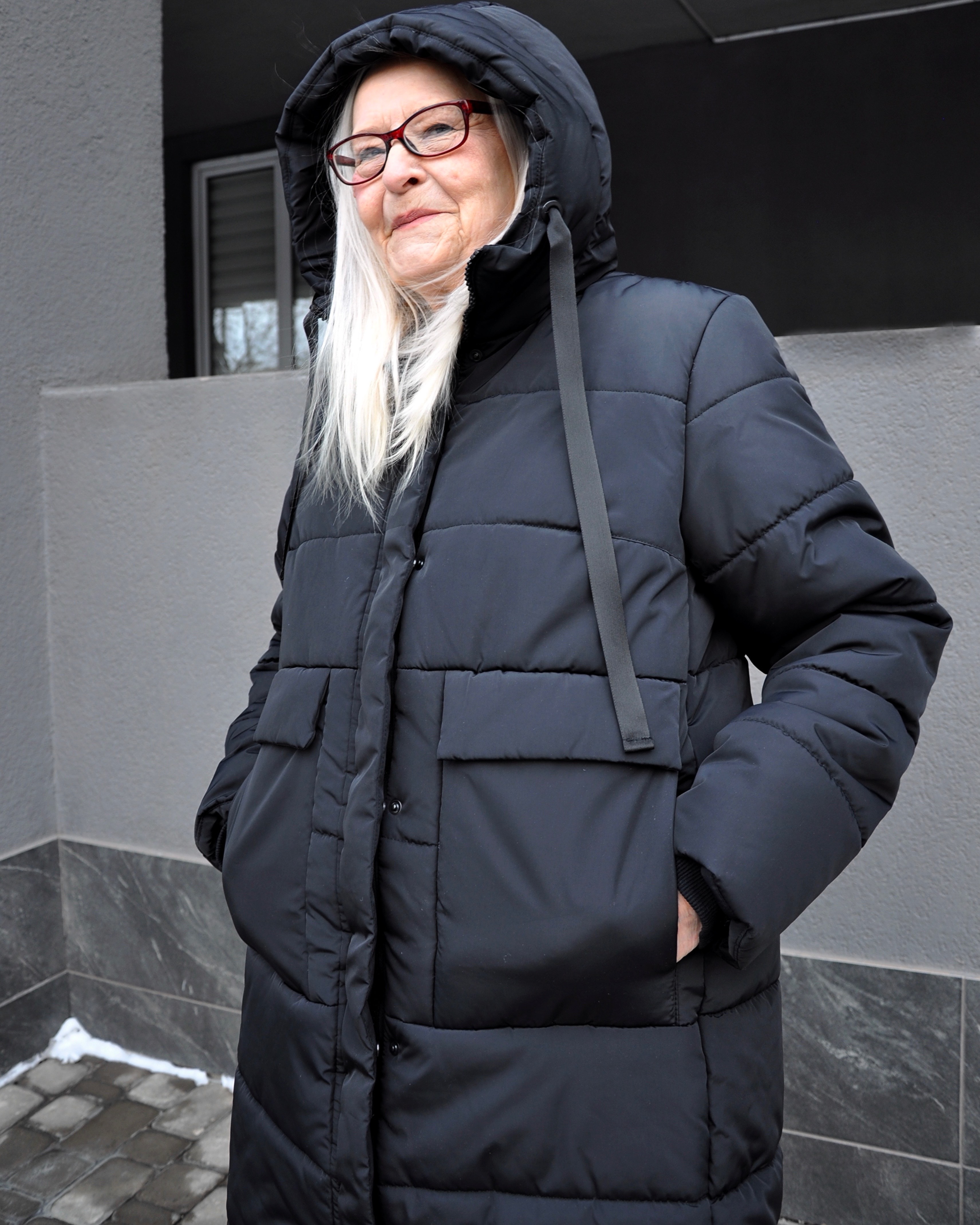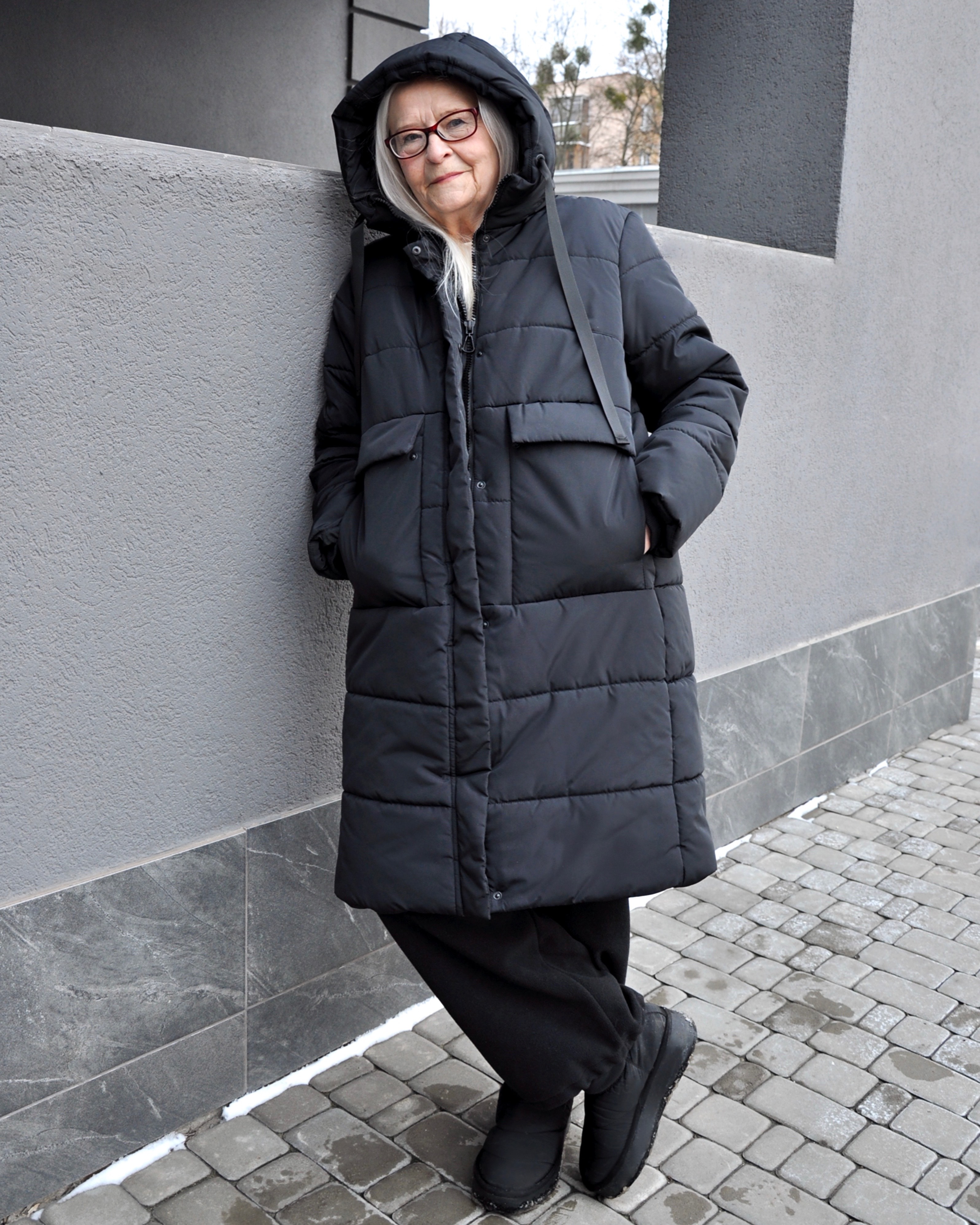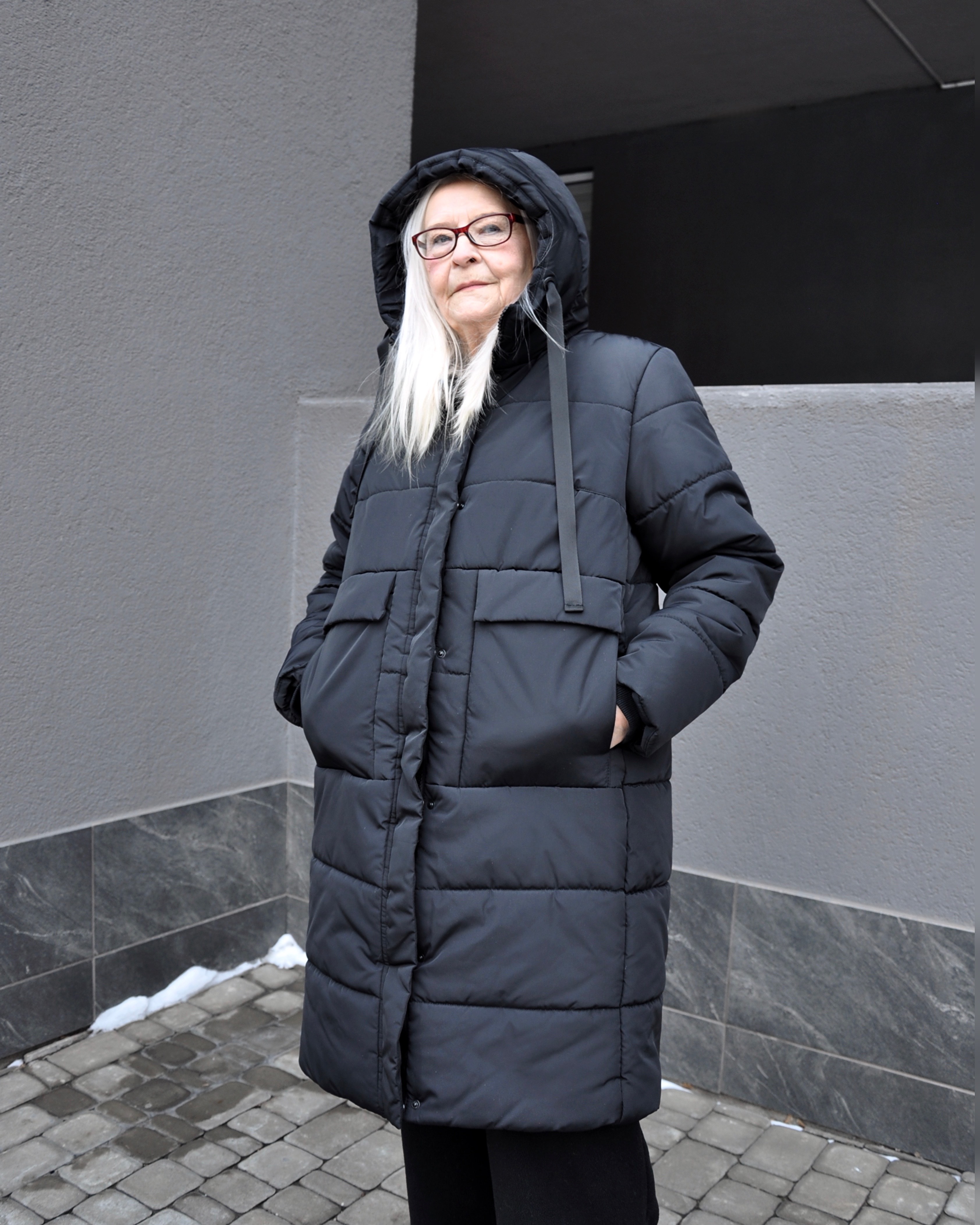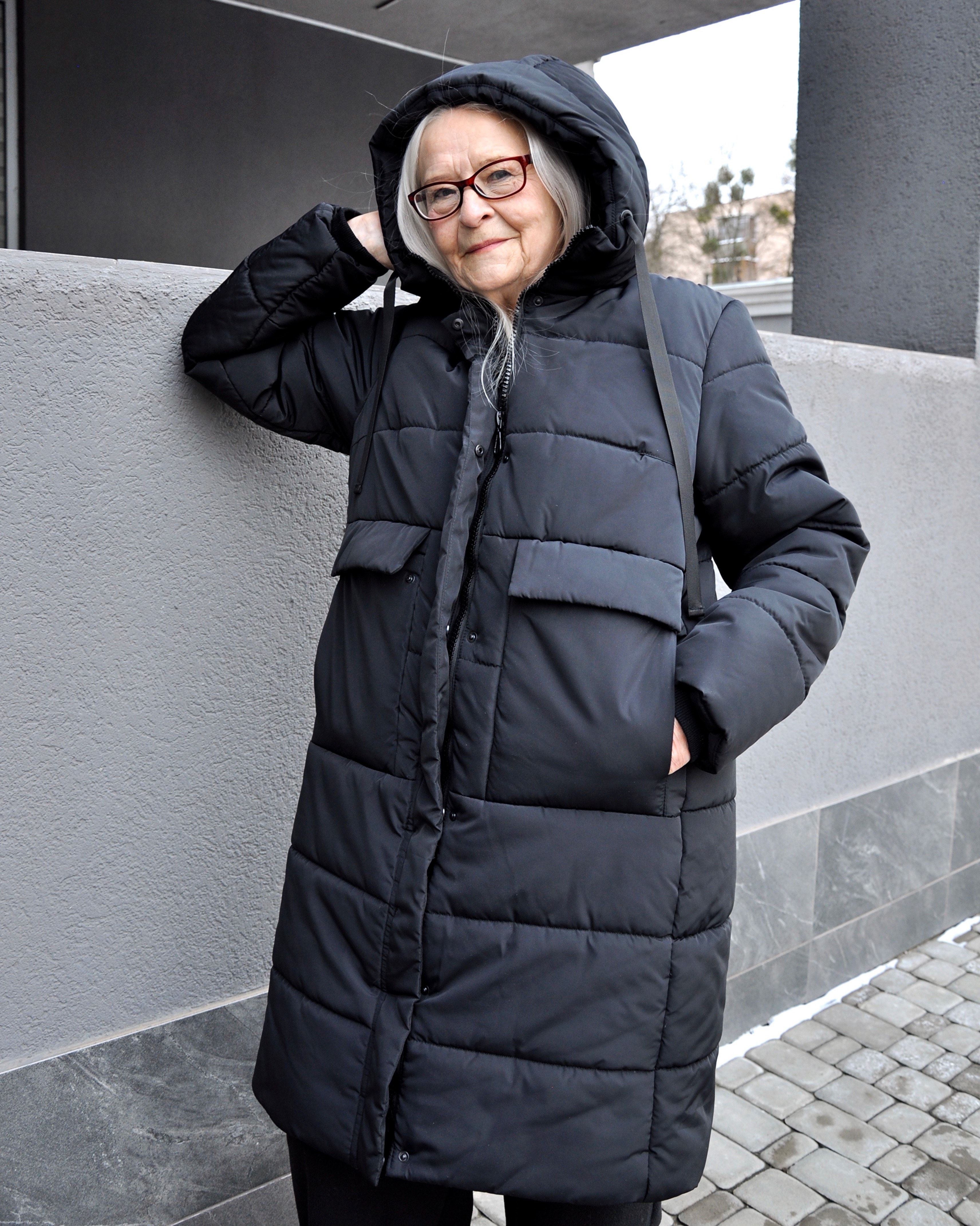 Зимова жіноча подовжена модель прямого покрою. На пілочках виробу - подвійні об'ємні кишені, з двома входами. Пальто з функціональним коміром стійкою, що переходить у зручний каптур. Рукав довгий, вшивний, двохшовний, з внутрішньою трикотажною манжетою, для захисту від вітру і снігу.