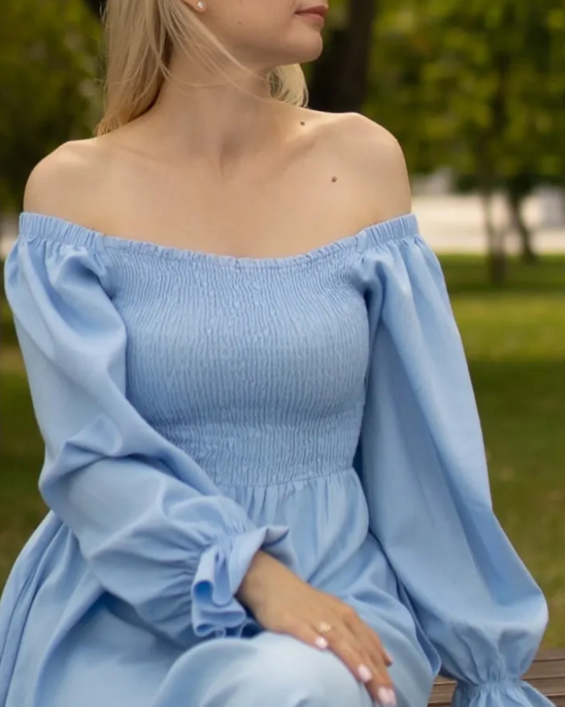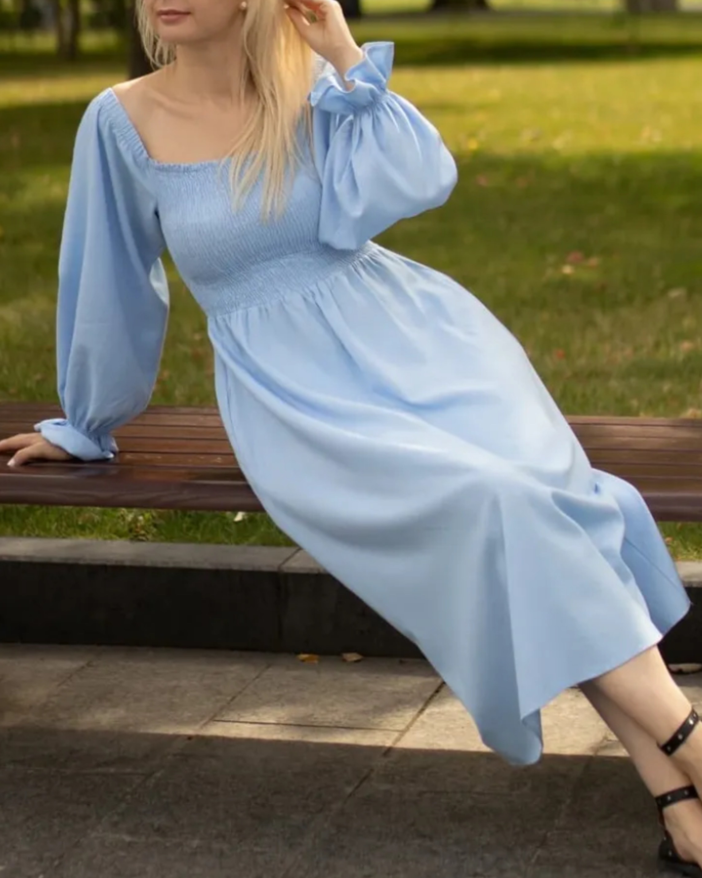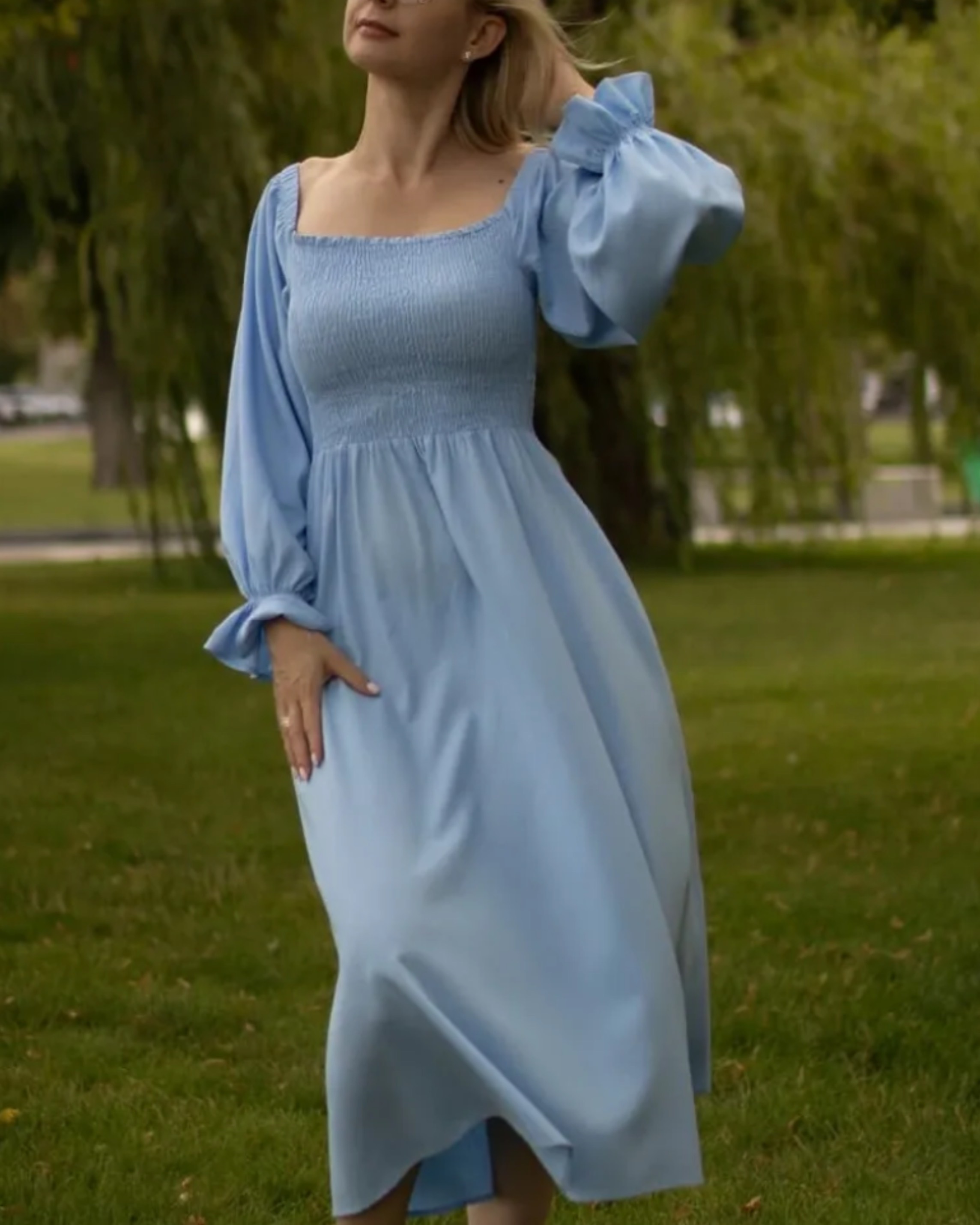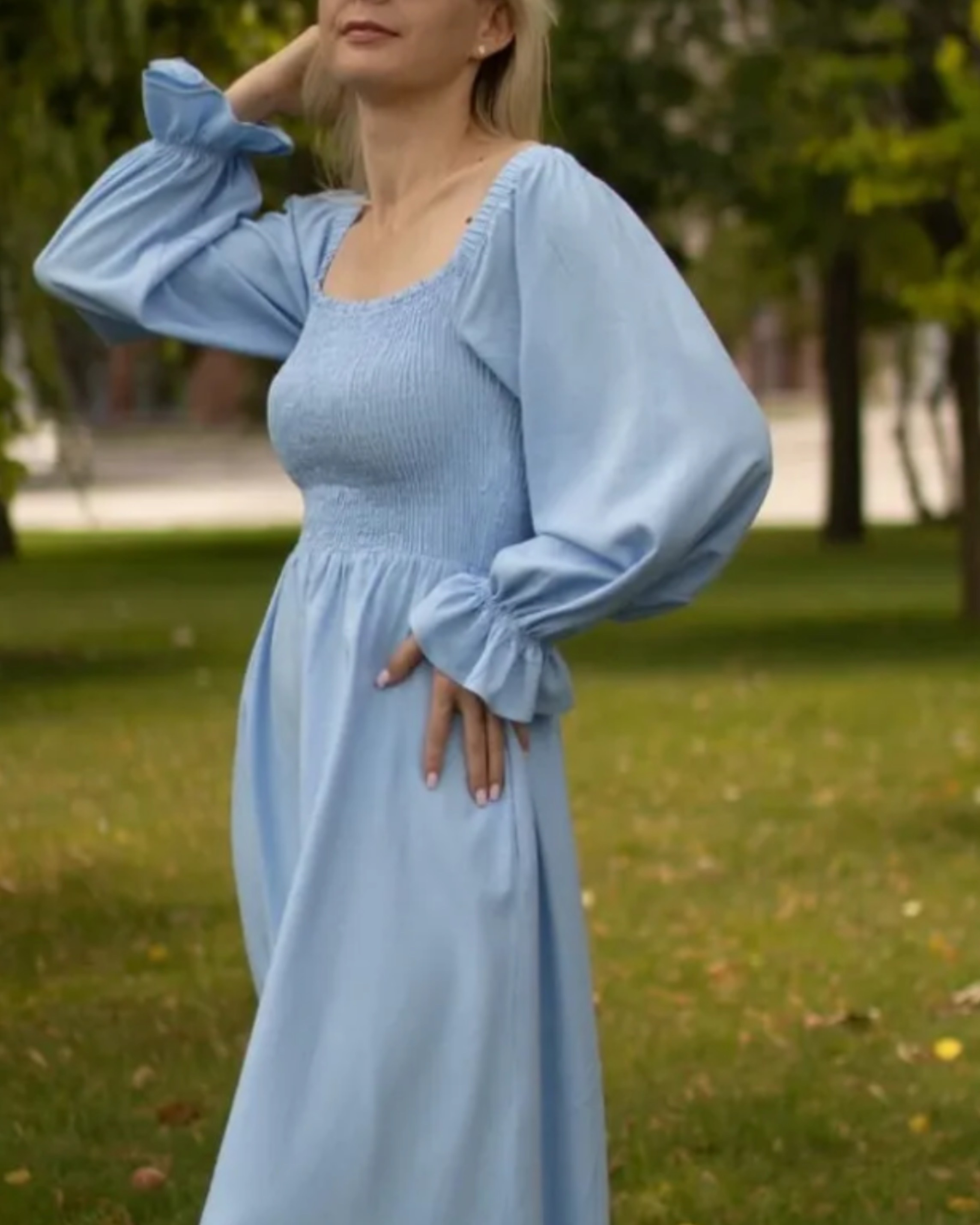 Ліф сукні облягаючий, спідниця вільна, розширена, з прихованими кишенями в бічних швах. Трендовий об'ємний рукав - довгий, на резинках по верху та по низу. Можна носити з опущеними або піднятими плечима.