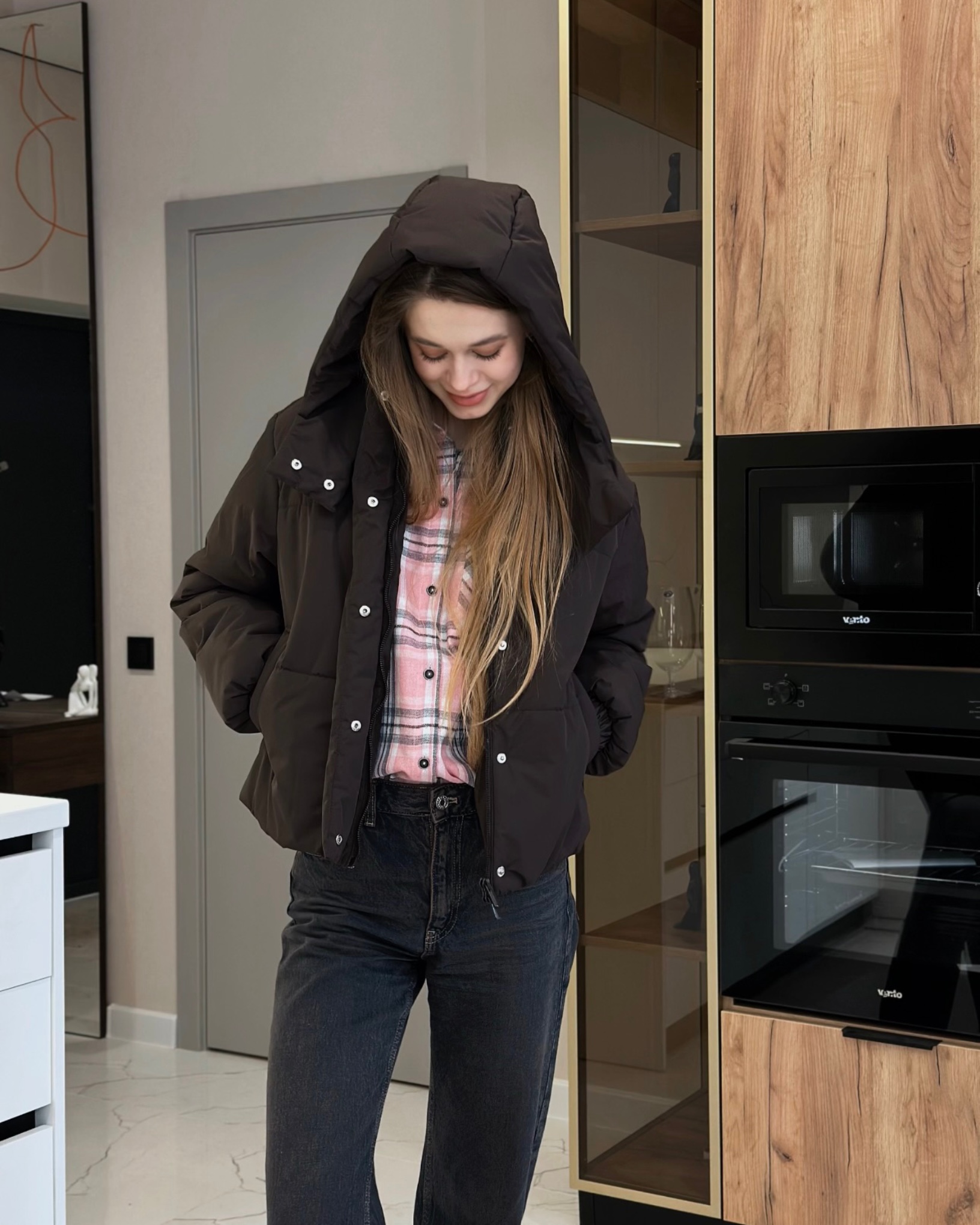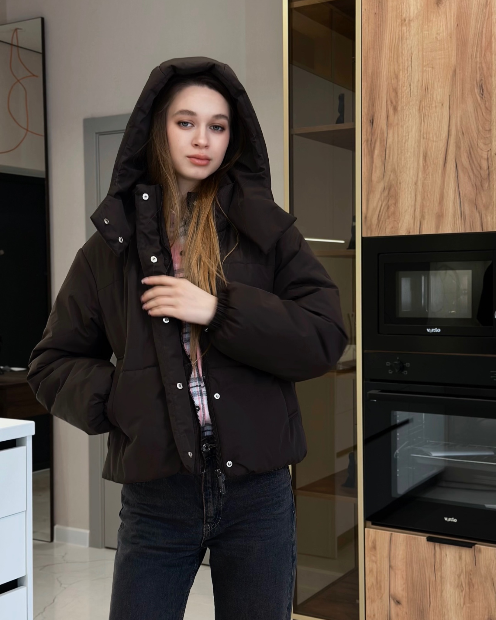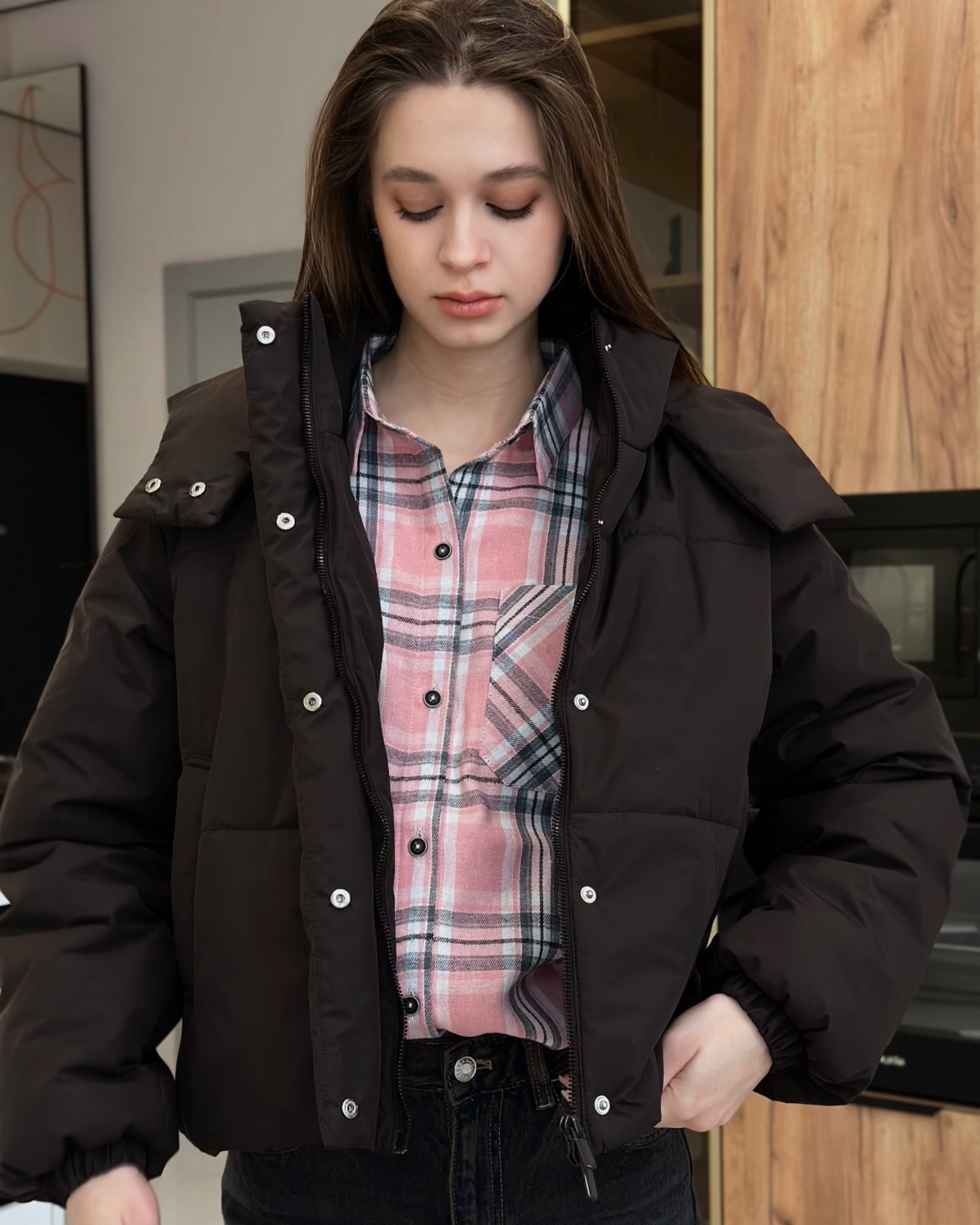 Демісезонна куртка актуального прямого вільного крою, утеплена синтепухом. Модель з спущеною лінією плеча і довгим вшивним рукавом. По низу рукава - пришивна вузька манжета всередині з еластичною тасьмою. Виріб з бічними кишенями листочками.