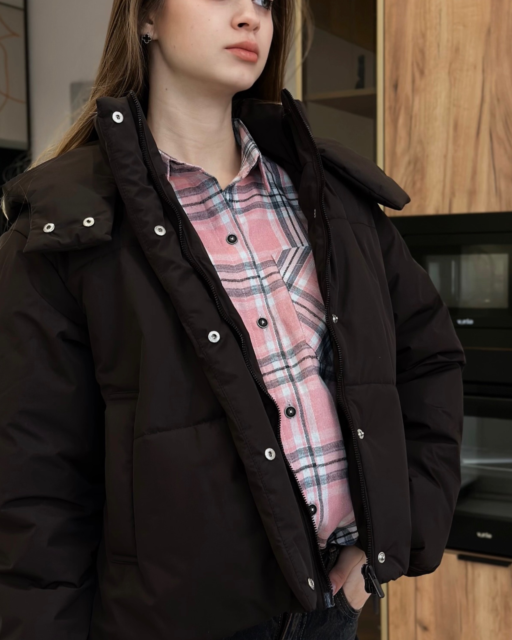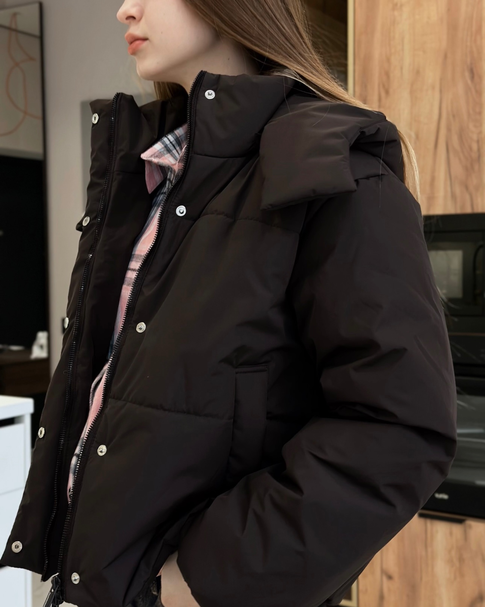 Застібка куртки подвійна - на центральну тасьму блискавку та планку з потайними кнопками. Виріб з коміром стійкою та з'ємним каптуром. По низу виробу - з виворітньої сторони, резиновий шнур з блочками та фіксаторами, для регулювання ширини по низу.