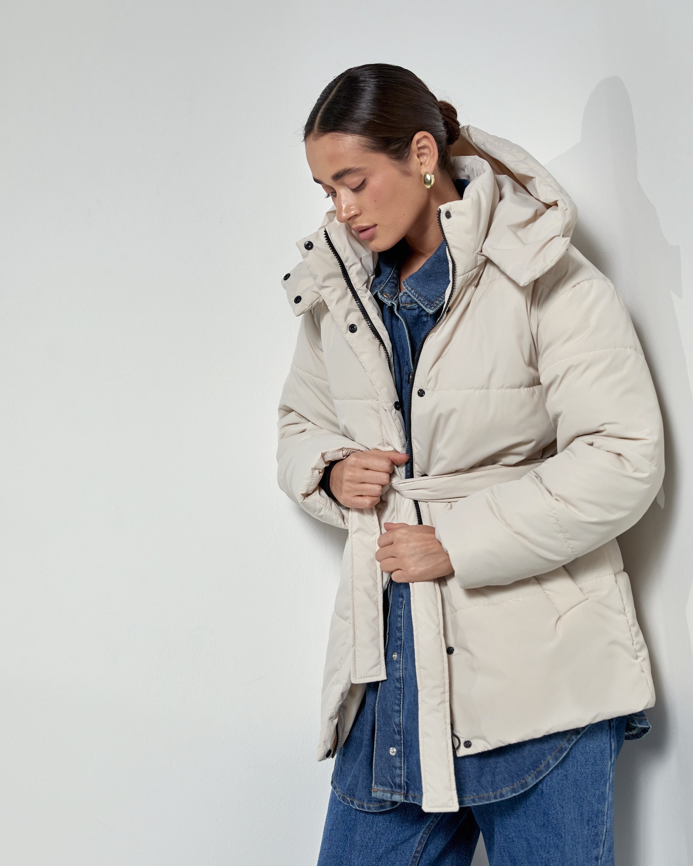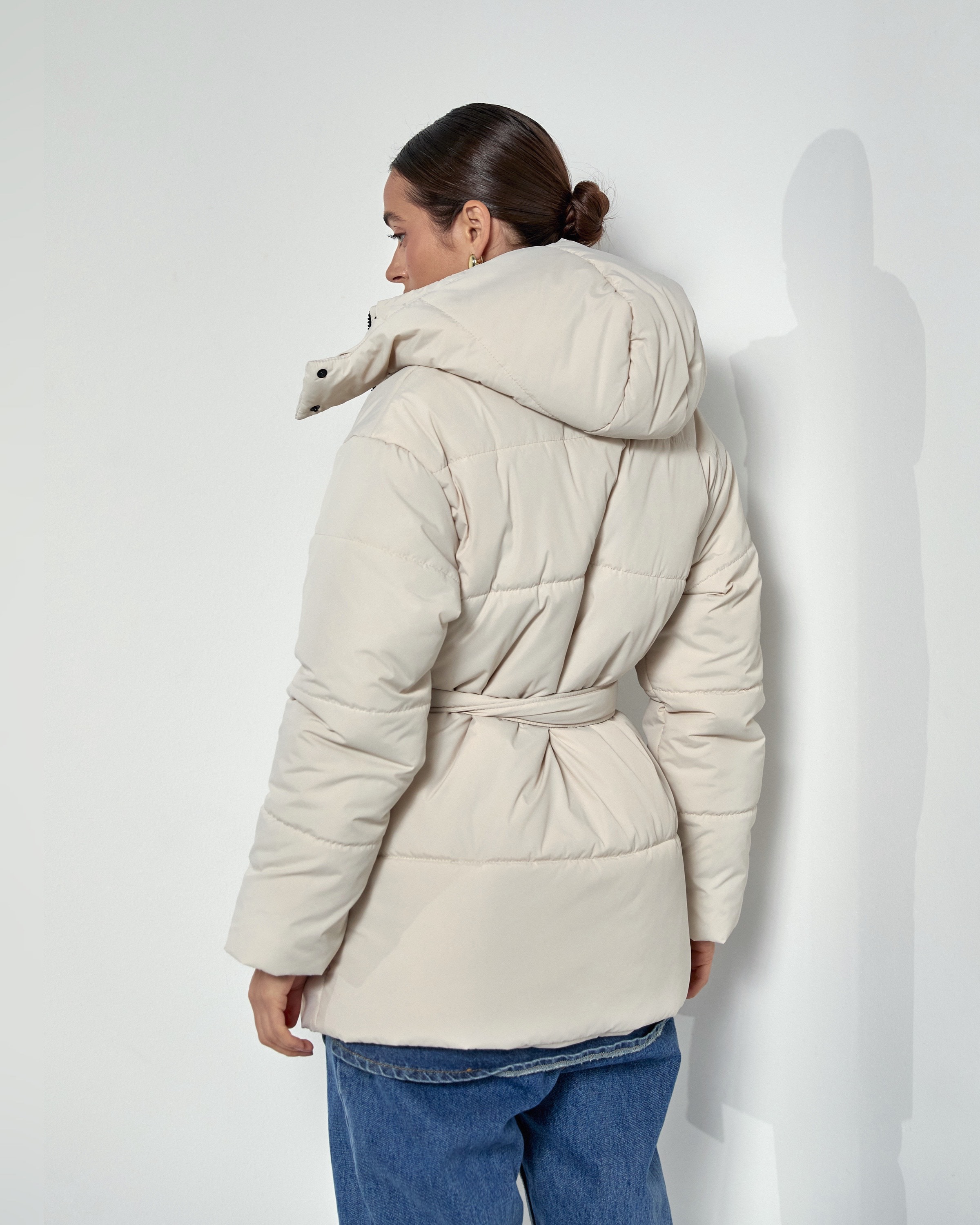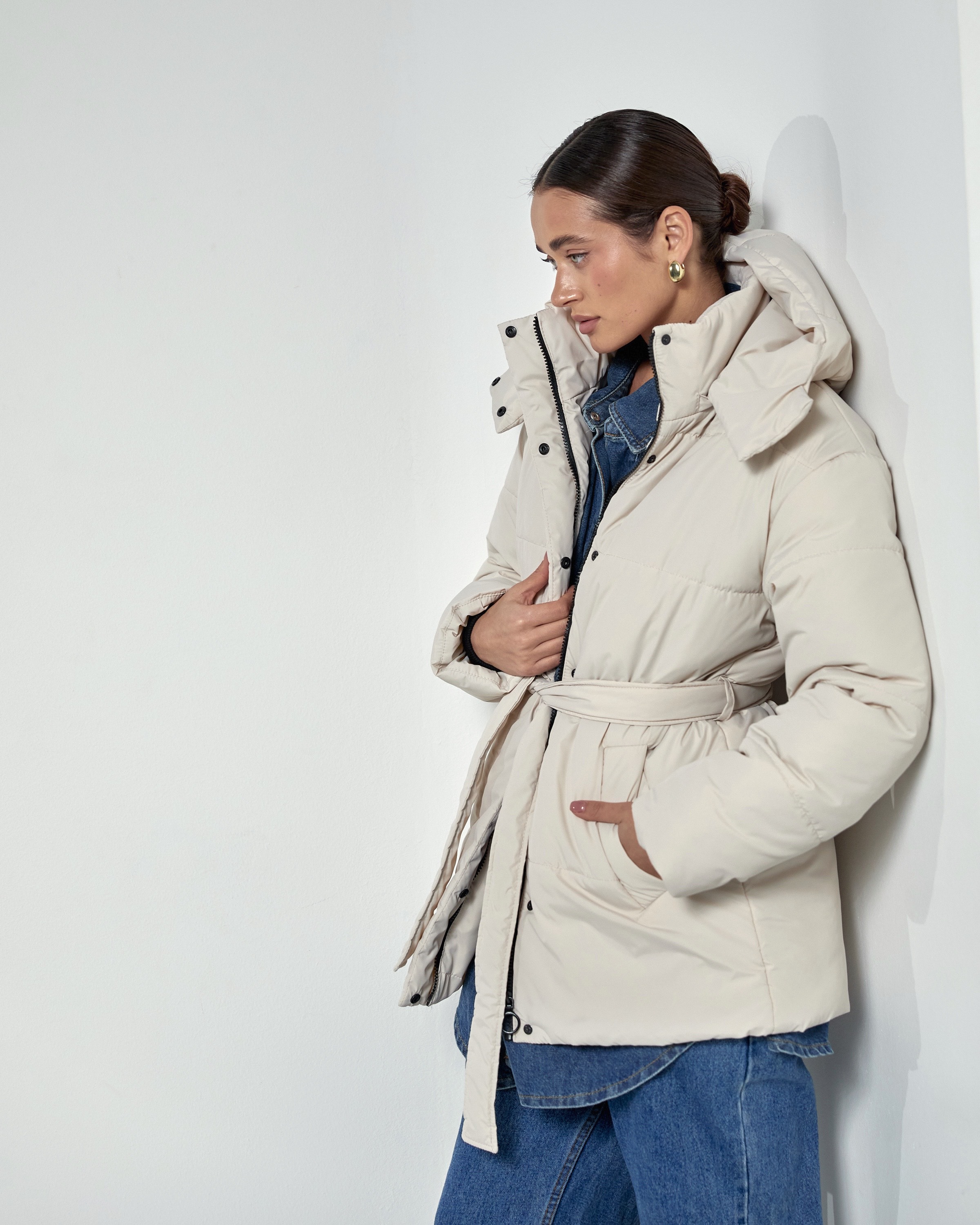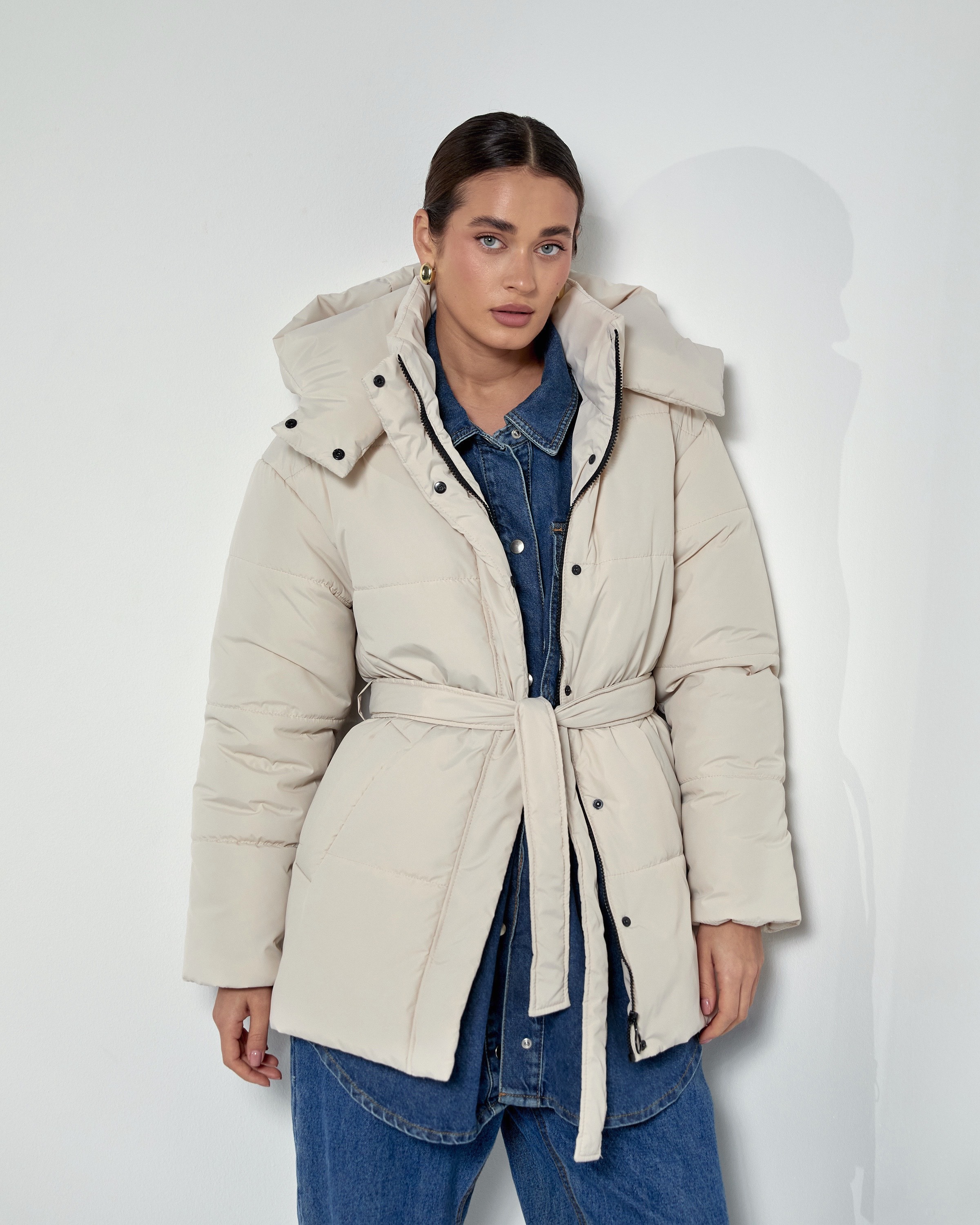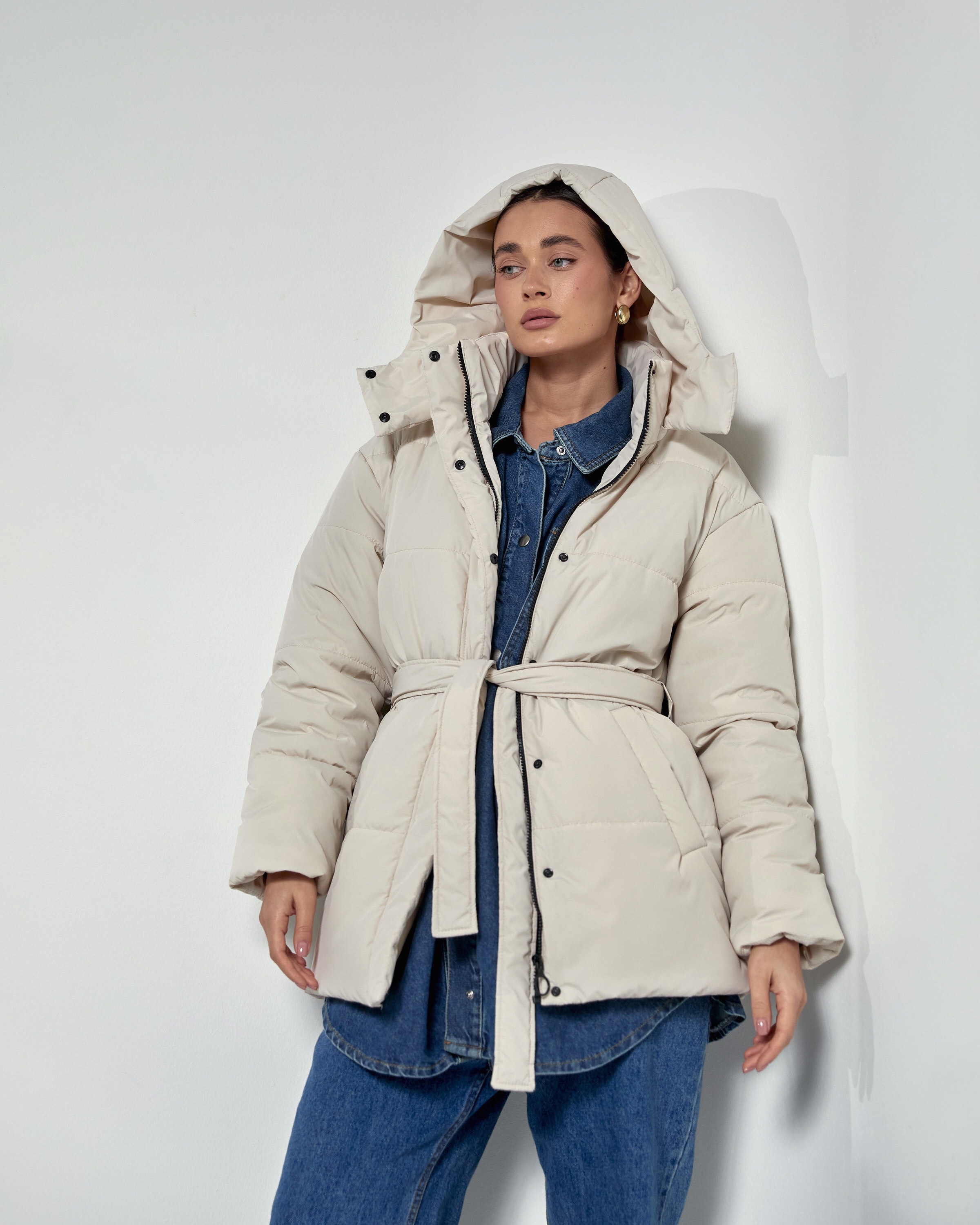 Демісезонна куртка актуального вільного крою з спущеним плечем, під пасок. Виріб утеплений на синтепоні.