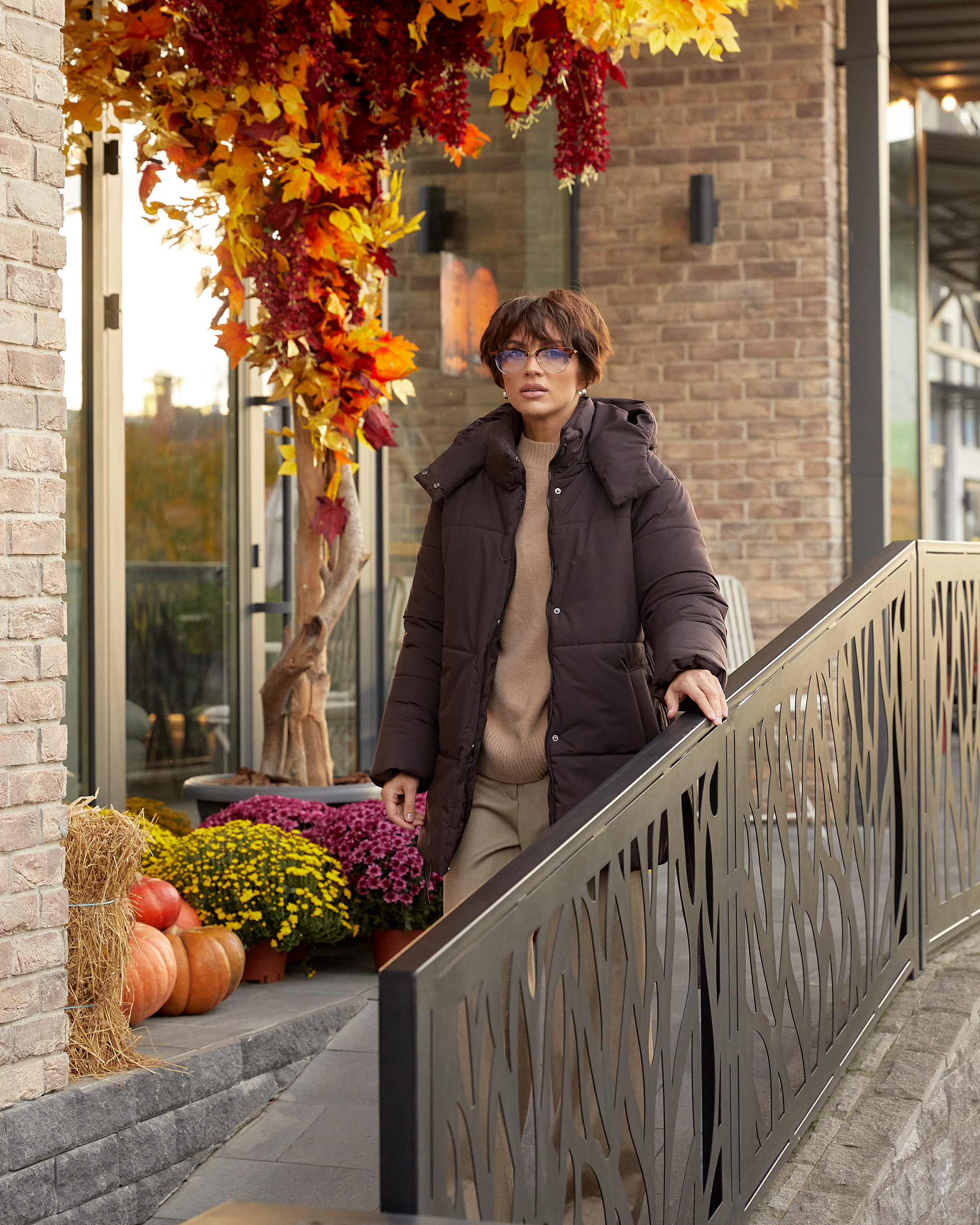 Куртка прямого, вільного покрою з розширеною і приспущеною лінією плеча. На пілочках виробу - прорізні кишені з листочками. Куртка з коміром стійкою та з зручним каптуром, що відстібається. Можна носити і без.