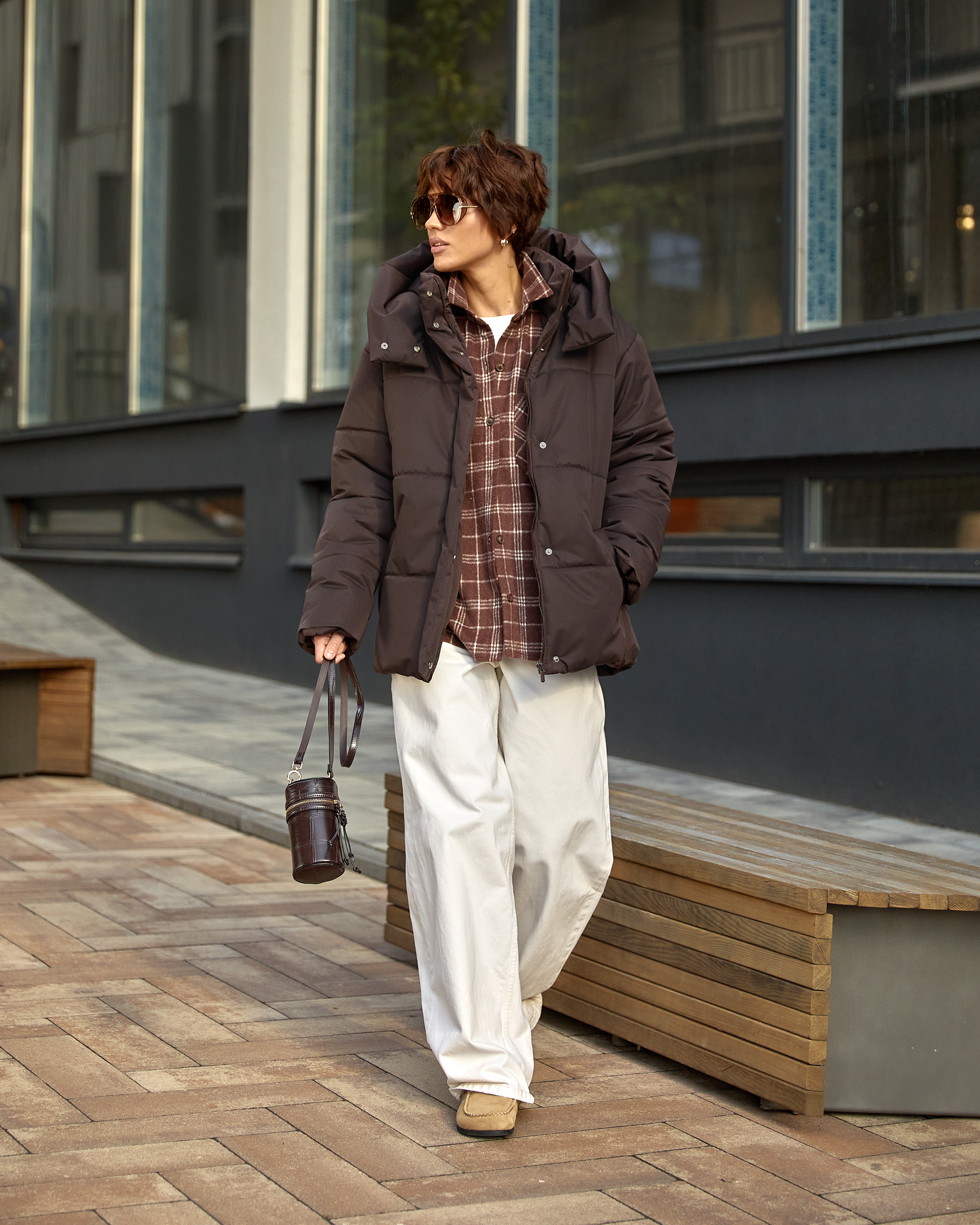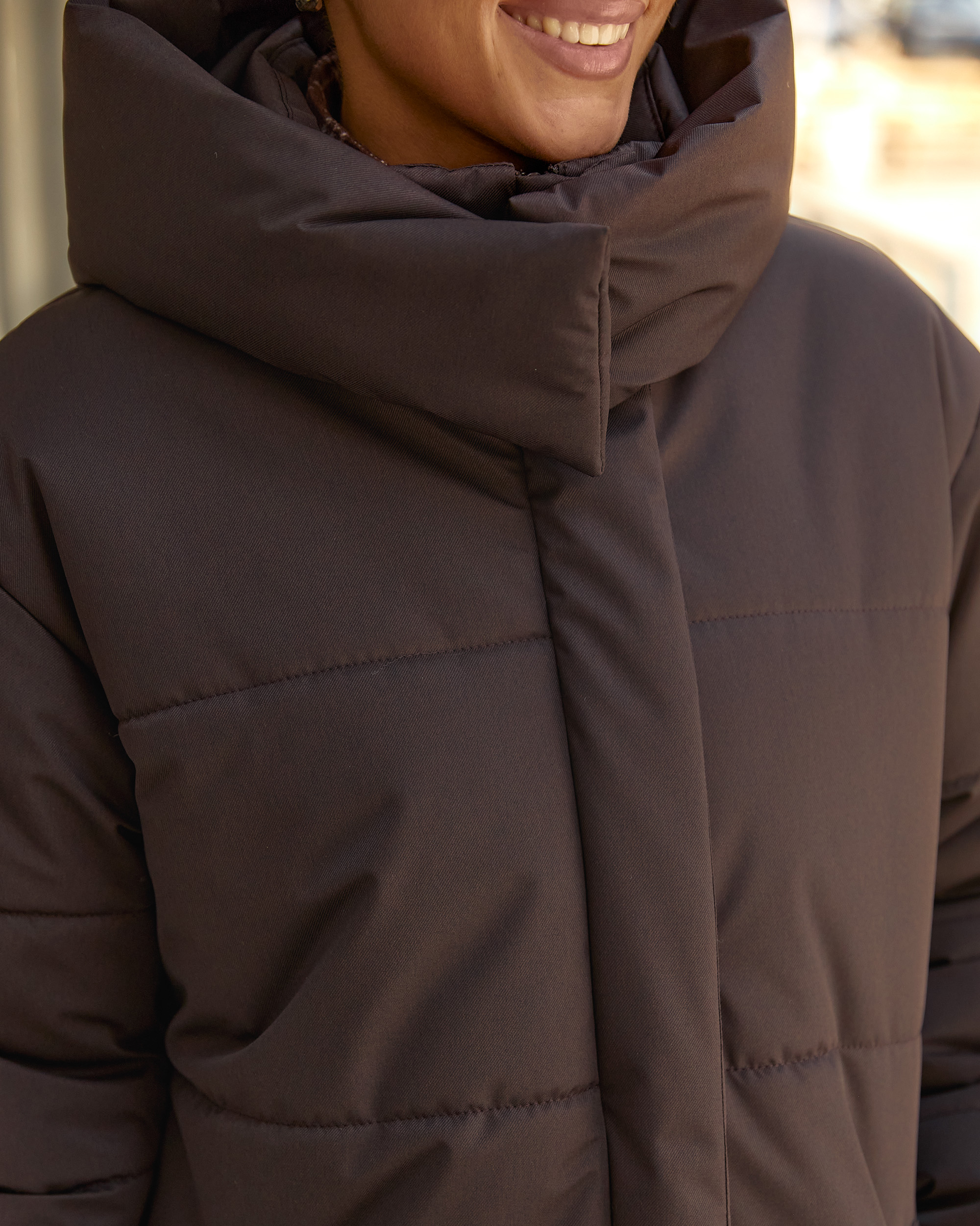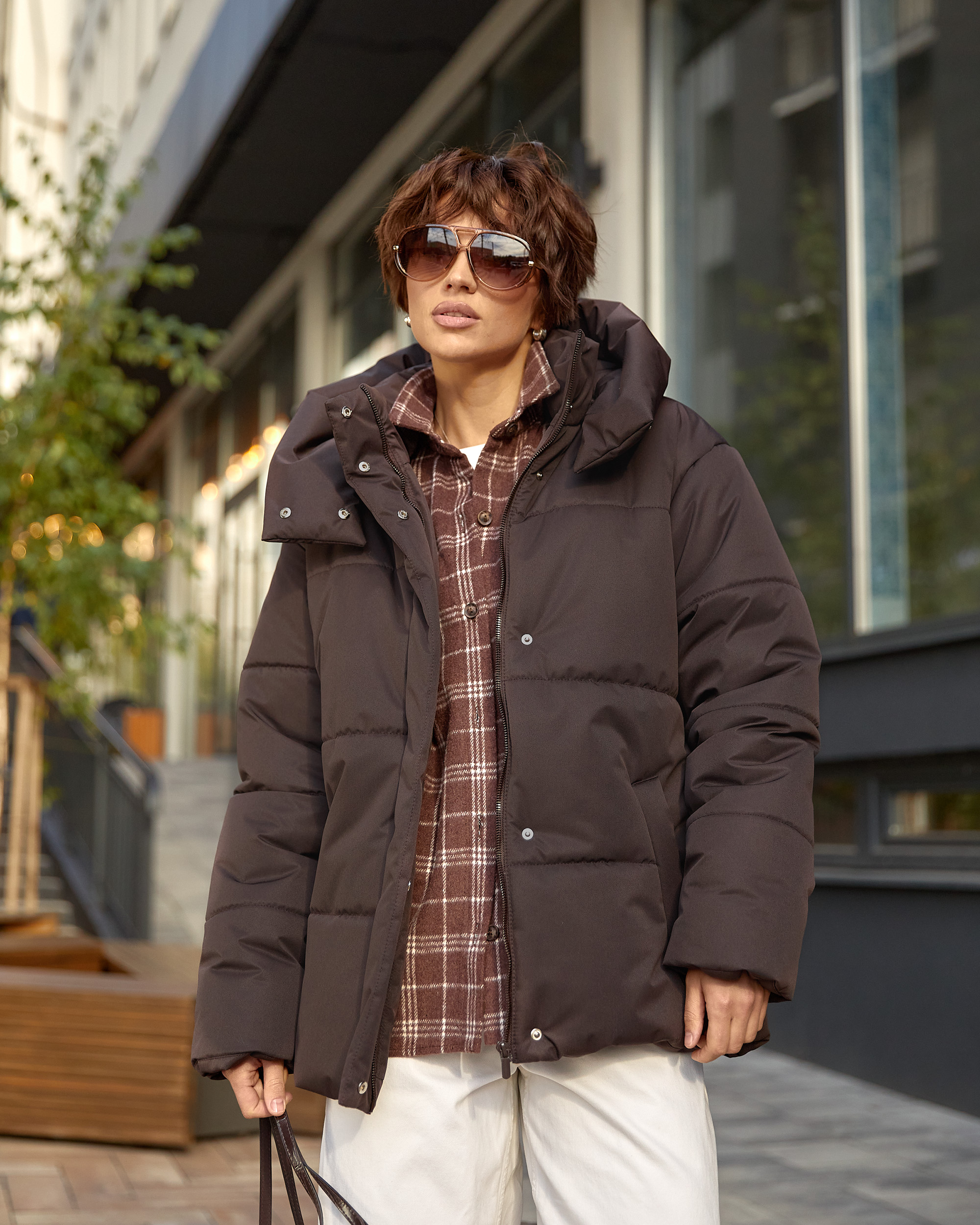 Куртка прямого, вільного покрою з розширеною і приспущеною лінією плеча. На пілочках виробу - кишені з листочками. Куртка з коміром стійкою та зручним каптуром, що відстібається. Можна носити і без.