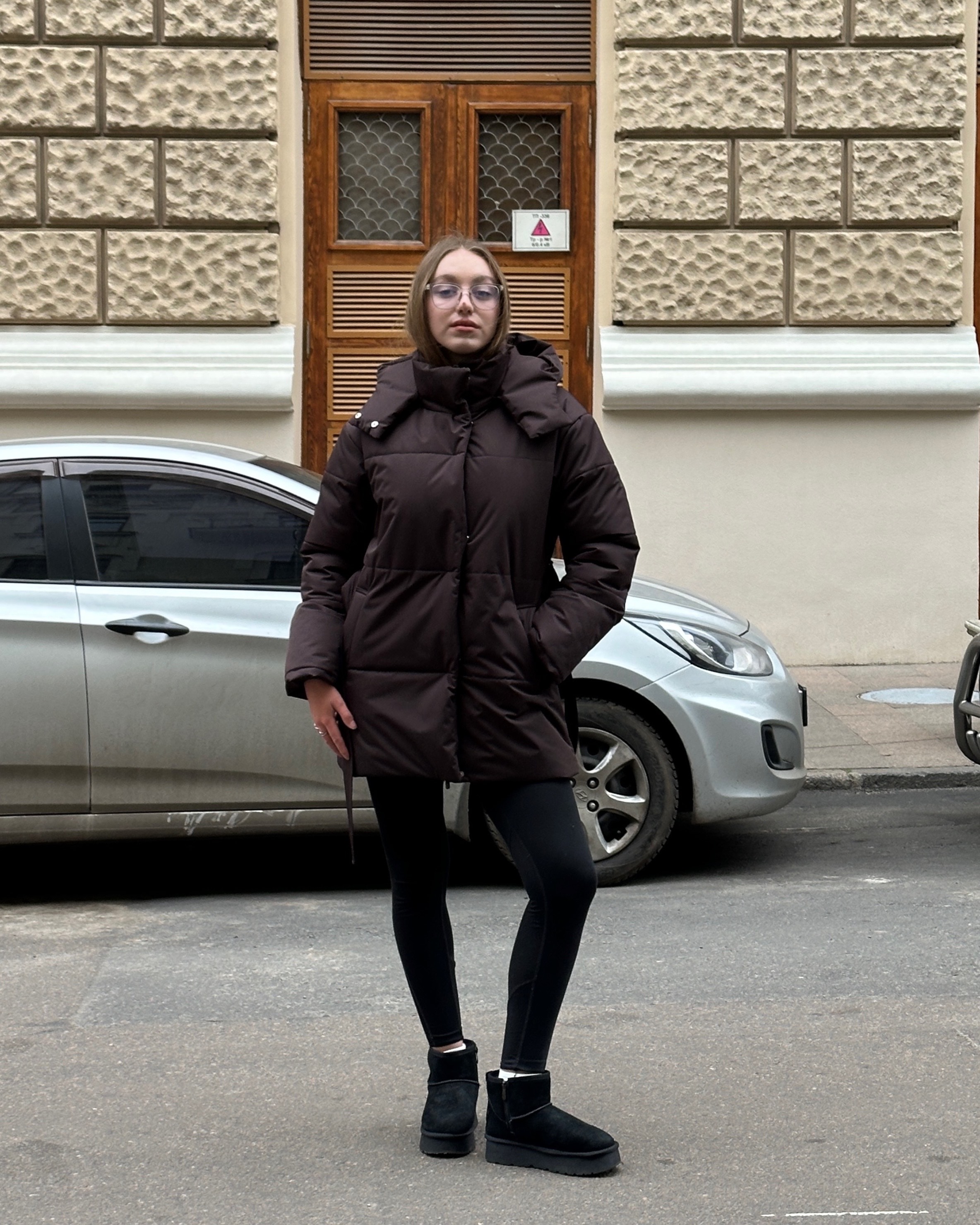 Куртка прямого, вільного покрою з розширеною і приспущеною лінією плеча. На пілочках виробу - прорізні кишені з листочками. Куртка з коміром стійкою та з зручним каптуром, що відстібається. Можна носити і без.