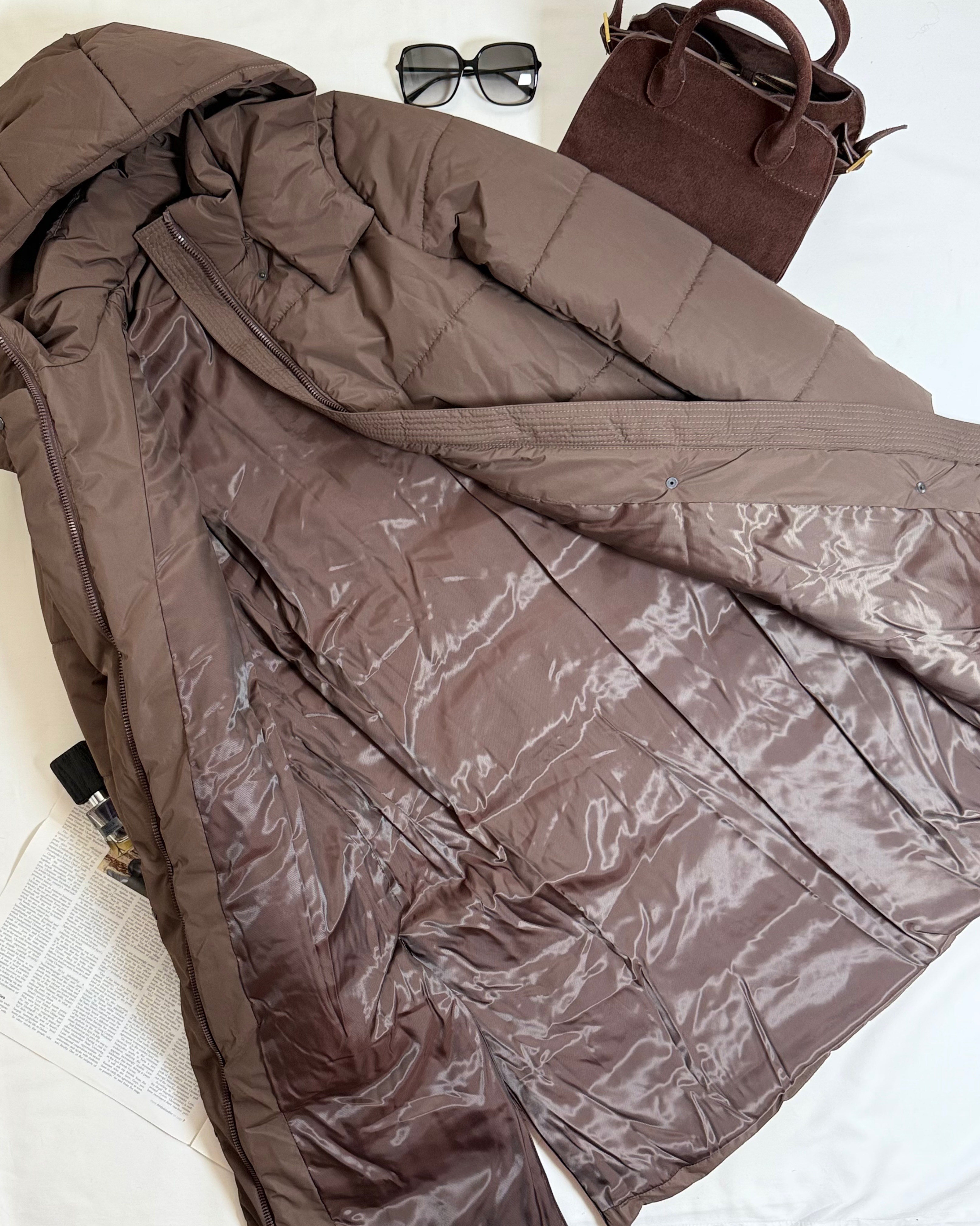 Пальто прямого покрою, на пілочках виробу - кишені з листочками в швах. Куртка з коміром стійкою та з зручним каптуром, що відстібається. Можна носити і без.