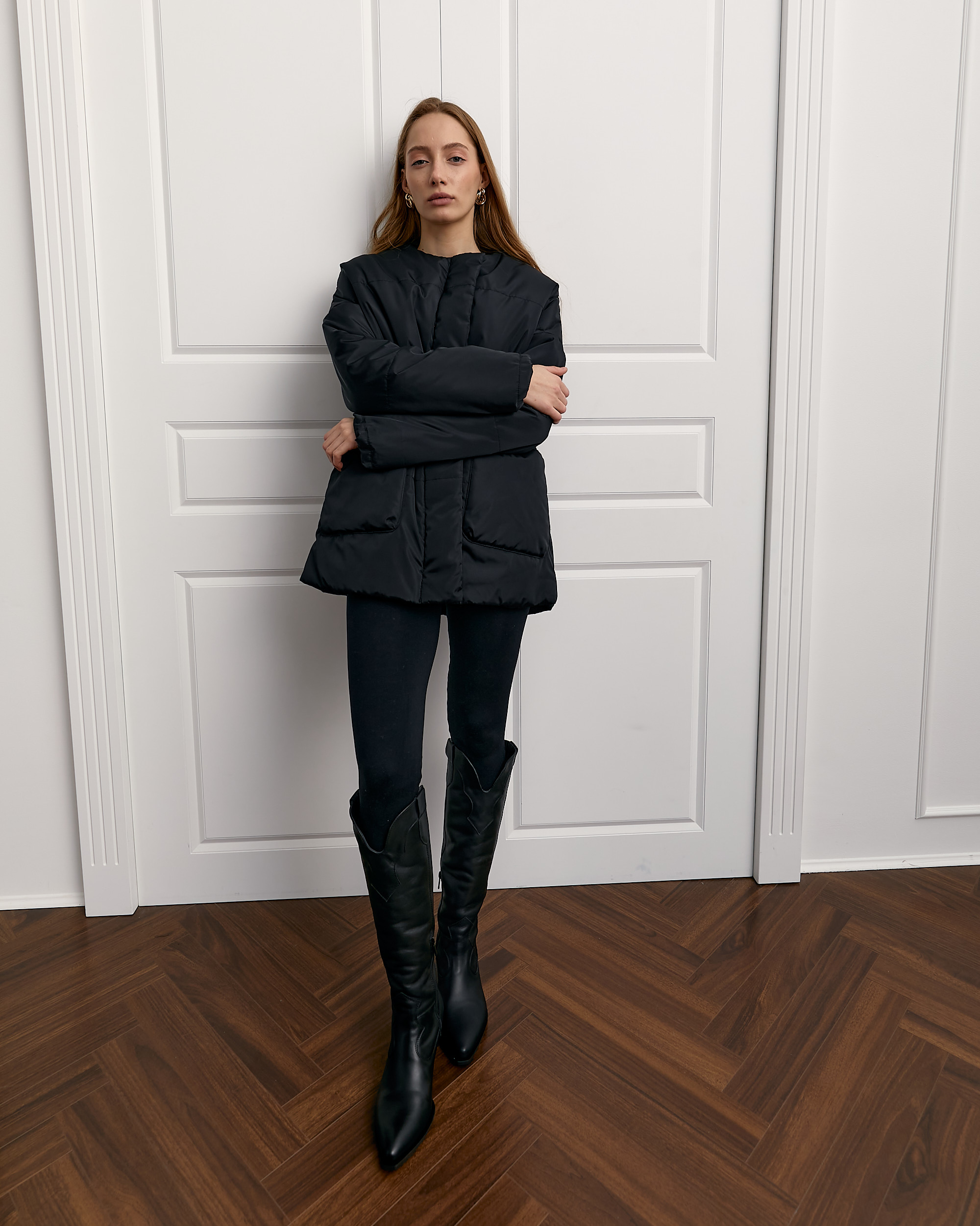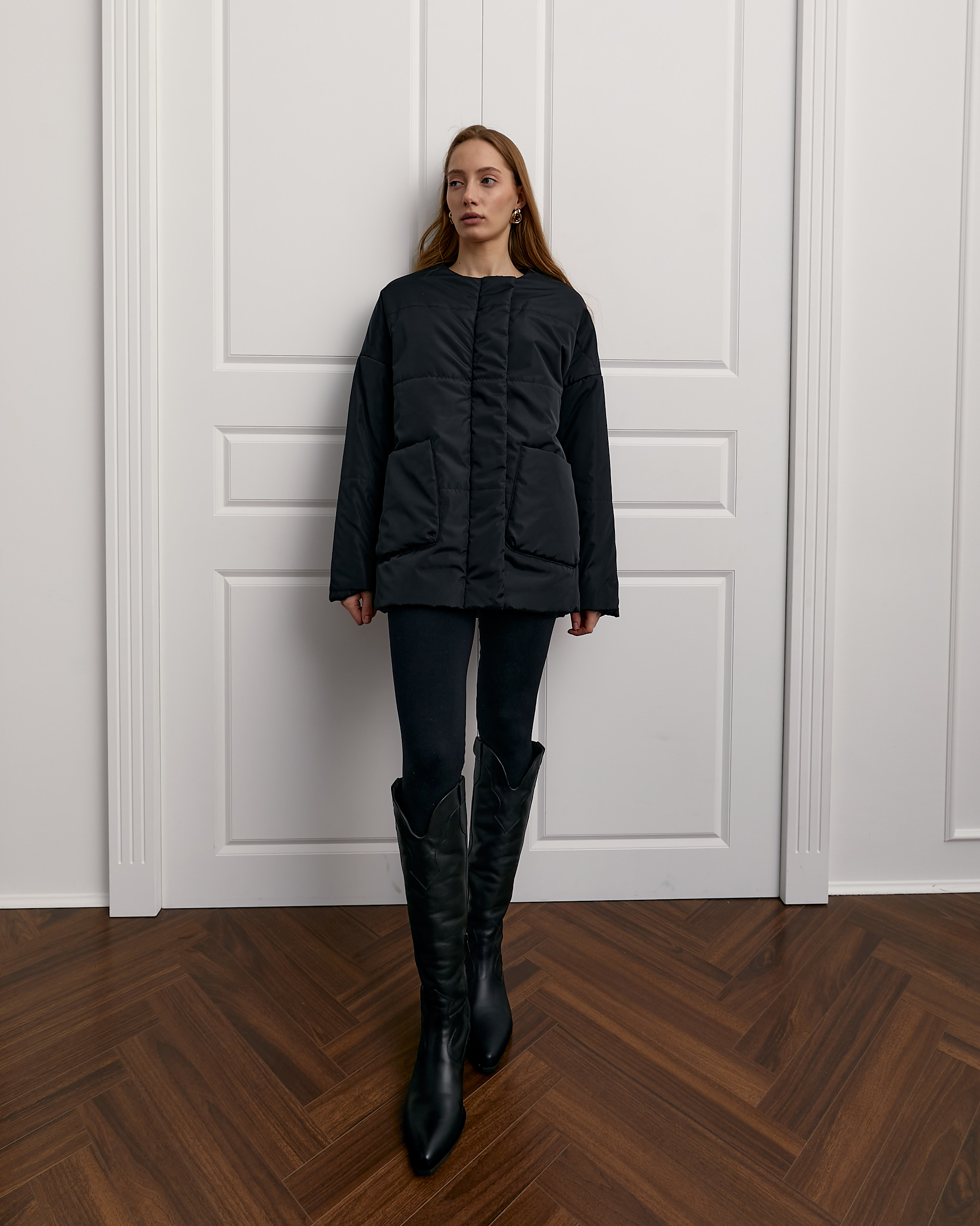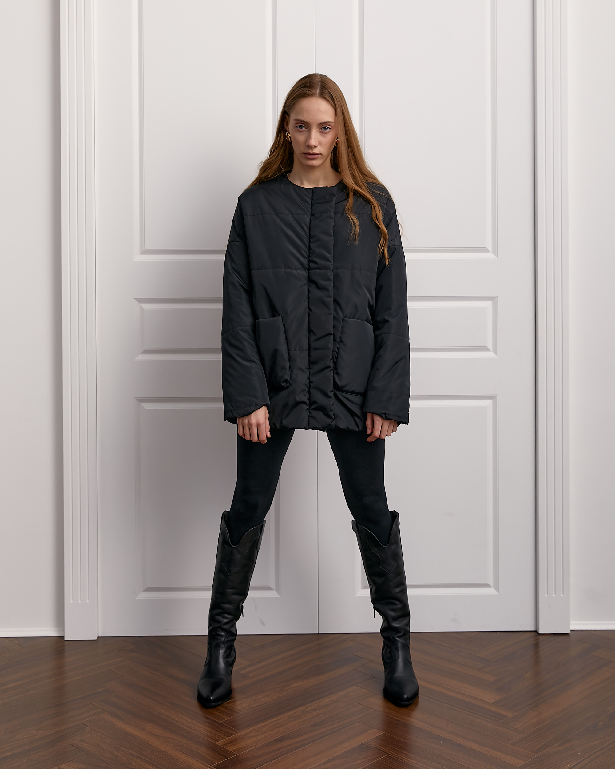 Застібка куртки подвійна на центральну тасьму блискавку та планку з потайними кнопками. Виріб без коміра, з округлим вирізом горловини.