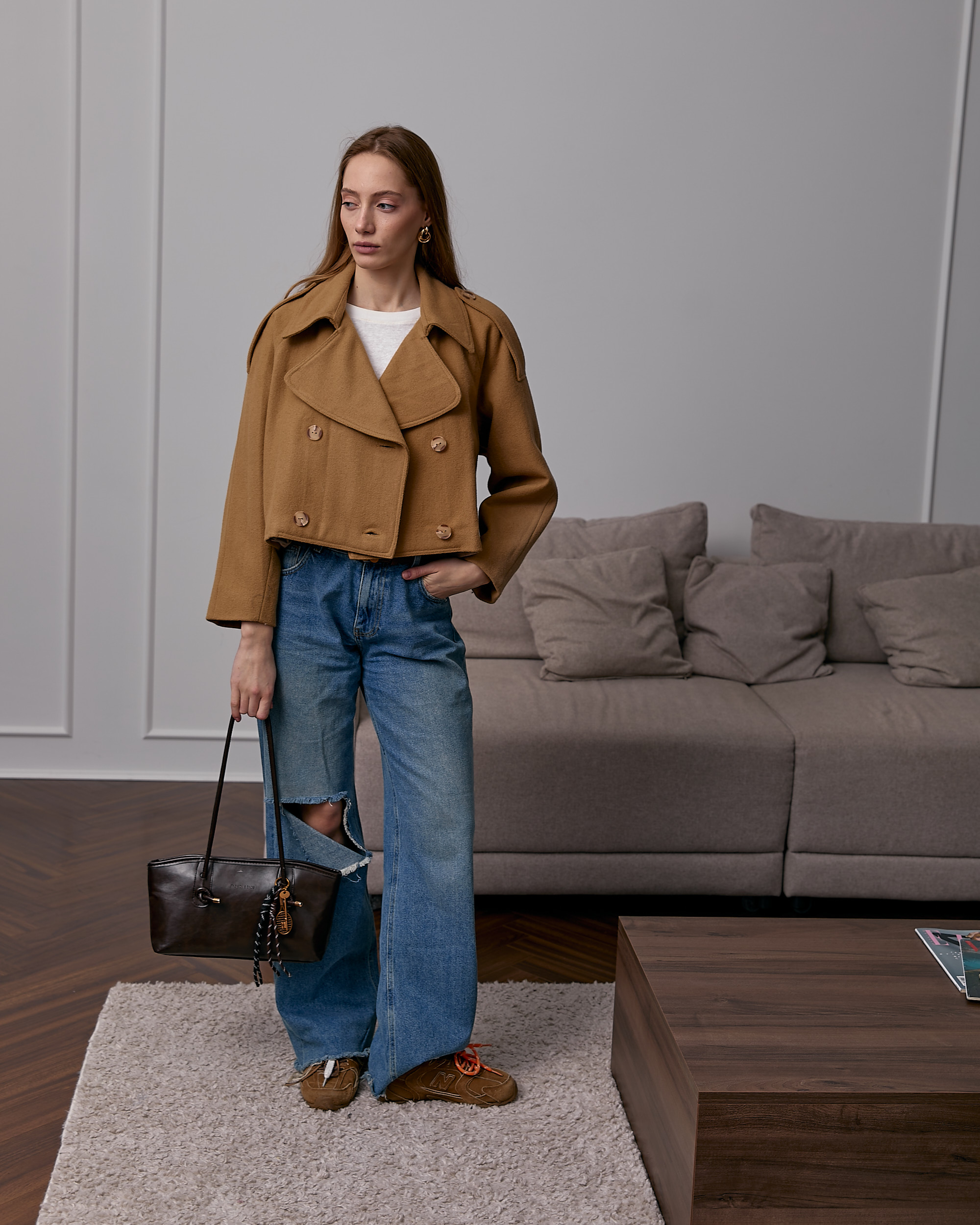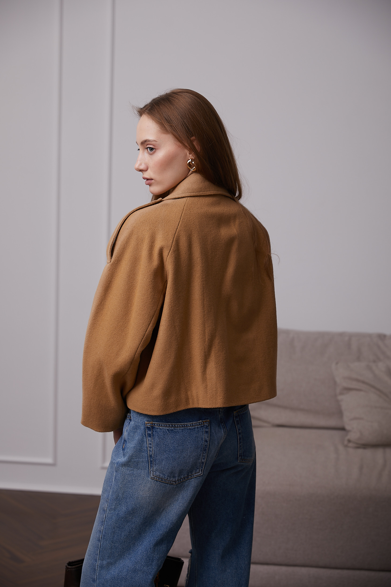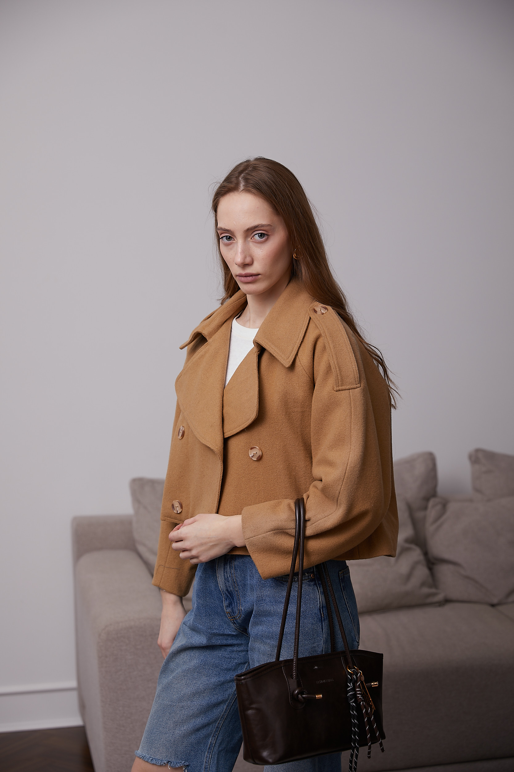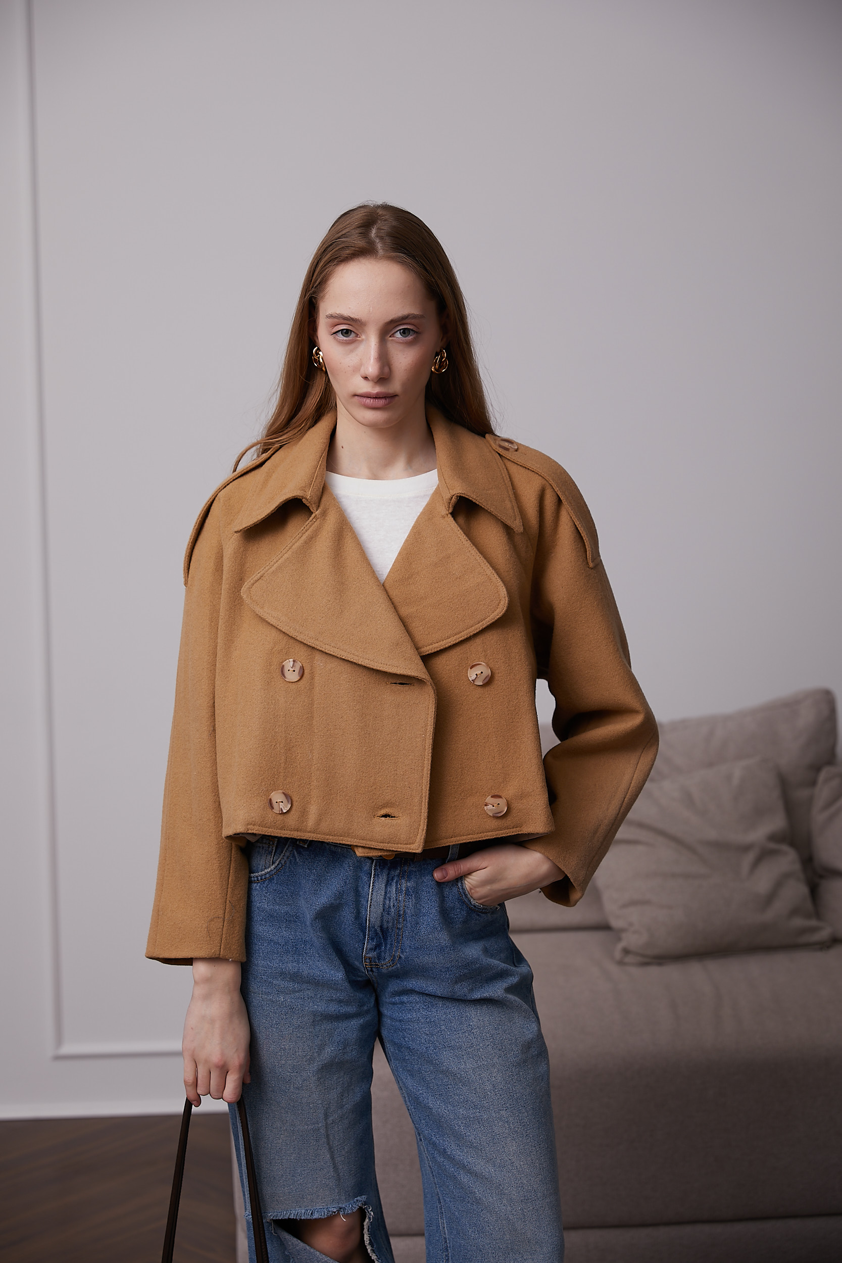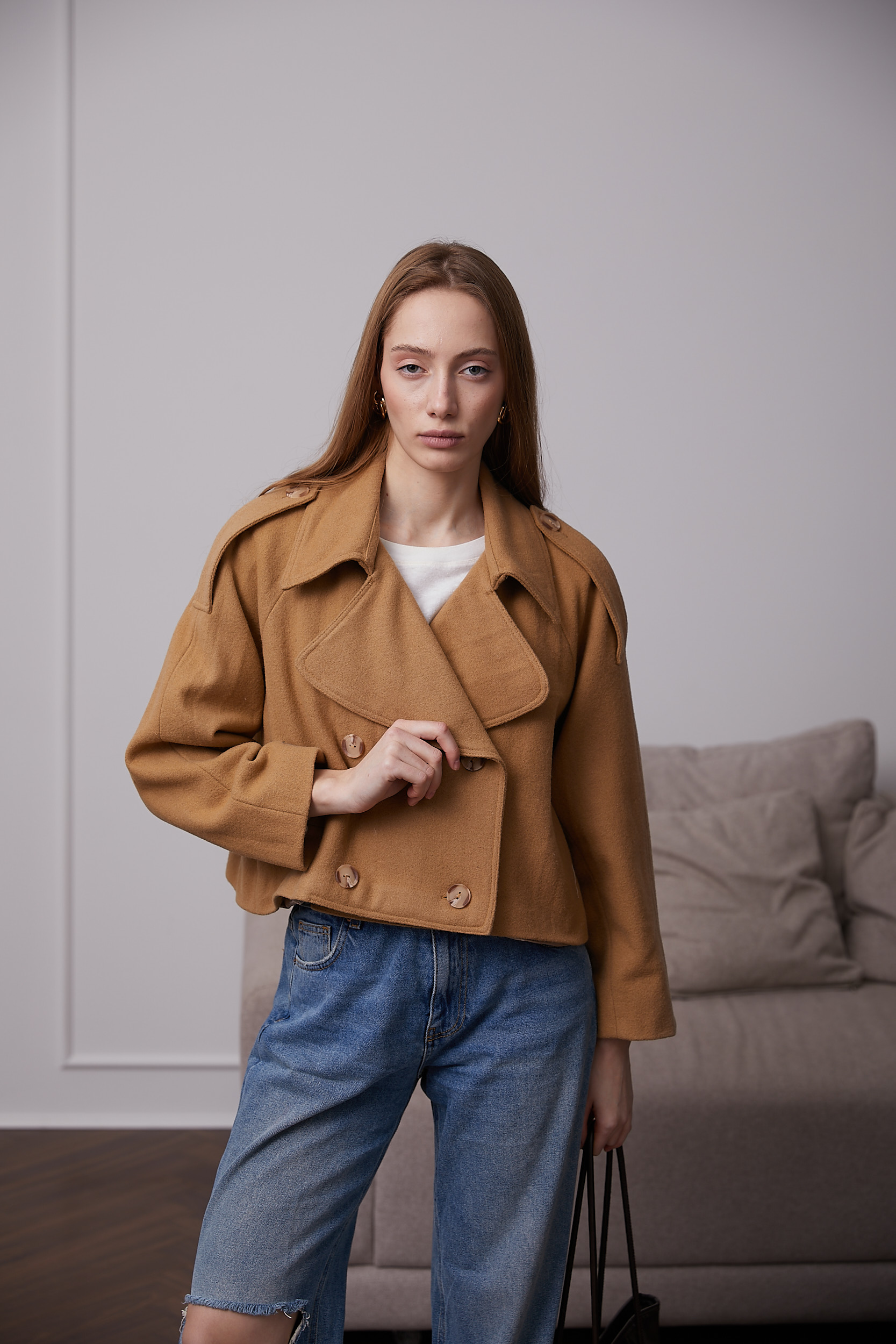 Модель виготовлена з вовняної пальтової тканини. Це нова альтернатива класичним тренчам.